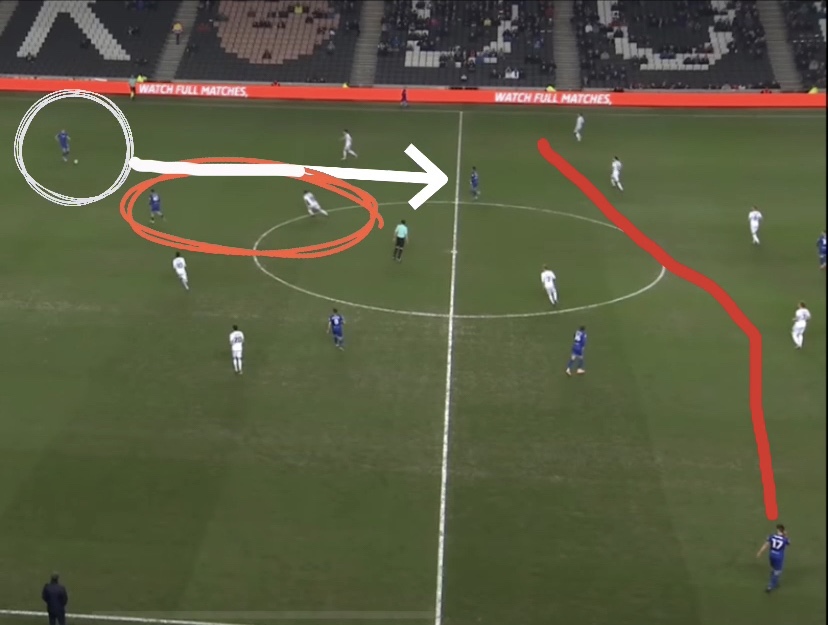 The centre back is given time on the ball but all short forward passes are cut off. A pass to the Wing Back would isolate him 2 vs 1 (RW and RWB) whilst a pass to the Central Midfielder would also put him under pressure. Therefore the obvious option is to pass to a striker 25 yards away in space. The Dons back 5 is deep and has allowed the forward to drop into the space in front.