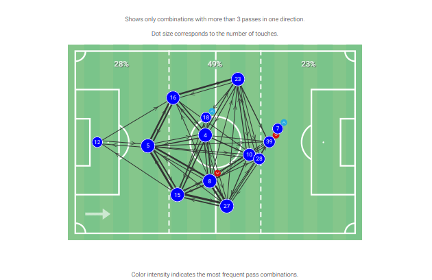 Defensively he performs well too, making 4.2 interceptions per 90 and winning 60% of all duels, which he averages 5.45 of per 90. Up against Naylor and Power he will have a real challenge on his hands but he does have the ability to control the game if given the opportunity.