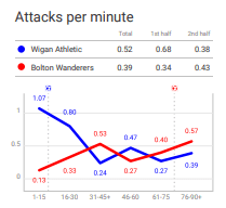 Half time came at a good time for both sides. Latics had slowed down greatly after their fast start and Bolton, although performing slightly better for the last 10 minutes of the half, needed to regroup in the dressing room and make some changes.