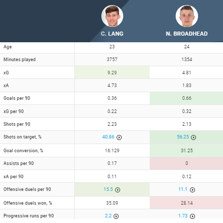 I’d say he’s a similar kind of player to Callum Lang when playing as an Inside Forward. Both are high volume shooters but as the comparison shows Broadhead is considerably better at finding the target with his efforts on goal.