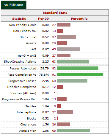 Defensively he’s solid enough which isn’t always the case with attack minded FBs. He wins over half of his defensive duels and averages well over a tackles per 90. He’s not the strongest physically which can leave him under pressure, particularly in the air.