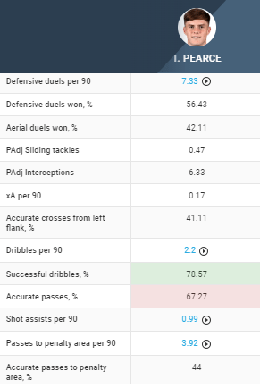 Going forward I really rate him. 2.2 dribbles per 90 and 78% completion is great and although he’s not rapid Pearce gets forward really well. Its fair to say he’s much more suited to the Wing Back role than a traditional Full Back but given how Kolo wants us to play he’ll have to improve at the latter.