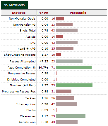 His xA and Shot-Creating actions are both high so to some extent the fact he has 0 assists this season isn’t his fault. He is creating a fair amount of opportunities, albeit not clear cut ones, but when you’re pretty much the main creator I’d still expect a bit more from him.