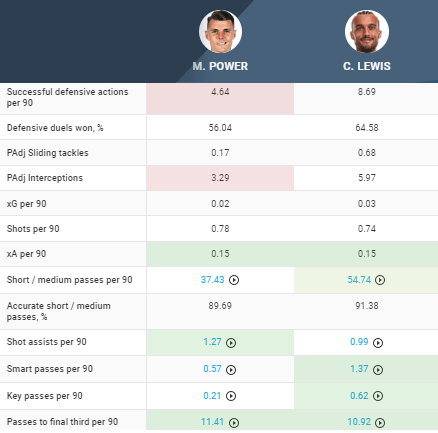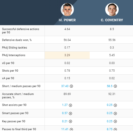 He keeps the ball well and is brave with it. Creating 1.5 shots and 0.13 xA per 90 is fantastic for a deep midfielder and having watched several of his performances I’d say his all round passing game is slightly ahead of Powers. He takes set pieces too which is something we need to improve on.