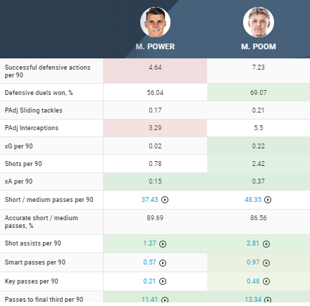 As I’ve said he’s not particularly good defensively, winning just over half his duels. His interceptions number is pretty decent but I’d certainly rather play him alongside a Shinnie/Cousins/Naylor type player than Power.
