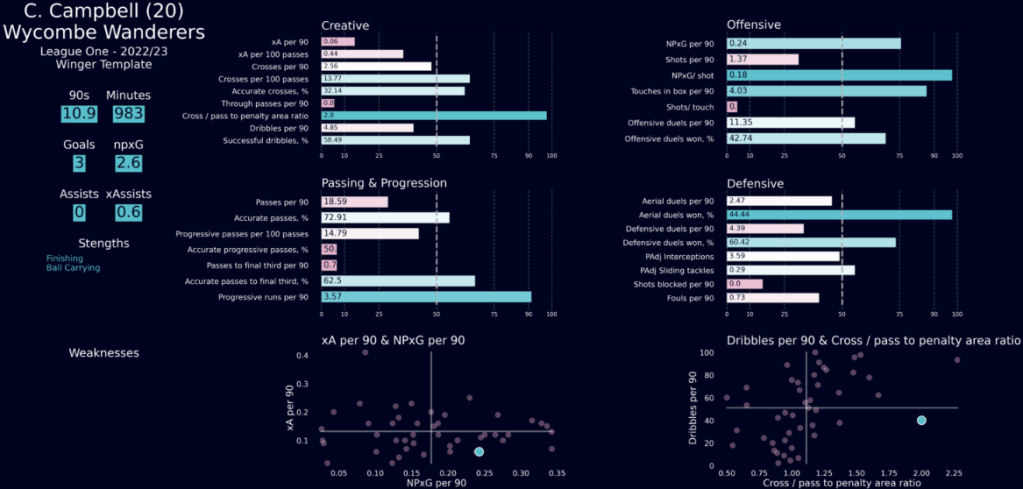 Overview: Wolves youngster Chem Campbell has made a name for himself in the EFL with a decent loan spell at Wycombe Wanderers. The 20 year old joined the Chairboys in January and put in some decent performances in a team that experienced change when long time manager Gareth Ainsworth moved on to QPR. He’s a direct dribbler who’s keen to take on his man and would be very useful on the counter attack because of his pace and flair, qualities we really lack at the moment. He’s more of a scorer than a creator and get’s himself into really good shooting areas, as seen with his high xG per shot. Whilst a quality I’d like to see added to the squad is long range shooting, it’s still important to have players who create high xG chances for themselves and others and Campbell would do so. His pace and trickery draws defenders towards him and creates space for others which again is something we don’t see enough with this current crop of players. He’s a natural winger and it might take some adapting to work as a slightly more narrow AM but it shouldn’t be too hard to do. A loan move would make a lot of sense.