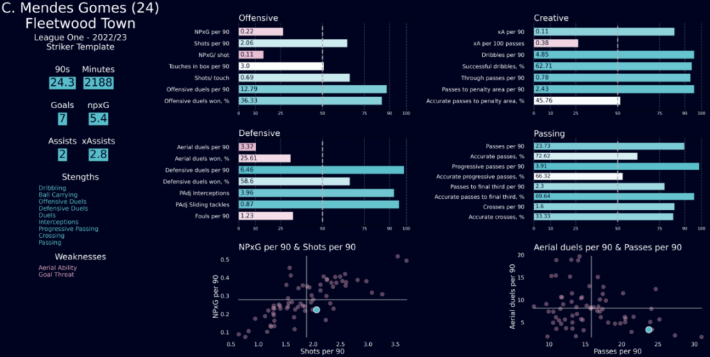 Overview: Another fantastically versatile forward Latics could pick up for nothing this summer is Carlos Mendes Gomes. He’s impressed on loan at Fleetwood last season and if we could tempt him back up to the North West it could be really smart business in the short and long term. At 24 he’s still got lots of development in him but he’s already a powerful, quick and technically gifted forward who can do a bit of everything in attacking areas. He runs with the ball really nicely and his close control makes it very hard to dispossess him, a quality lacking in our team at the moment. When he gets into passing / crossing areas his end product is usually on the money and that should continue to improve working under Maloney and his coaches. Perhaps not as much of a goal threat as he could be but providing we bring in a quality no9 this summer there won’t be too much pressure on CMG to score all the goals and that could suit a player like him who plays best when the shackles are off and he can play his natural game. If he’s available on a free we should go all out for him, just look at the graphic above…