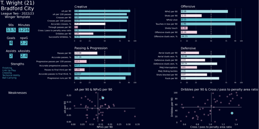 Overview: A pacey, left footed option to kill two birds with one stone in terms of the missing profiles, Tyreik Wright may well be available on loan this summer following Plymouth’s promotion to the Championship. He didn’t set League One alight in the second half of last season but his spell on loan at Bradford in the first half of the campaign was very impressive and proof that he can shine when given game time. Really impressive in terms of chance creation, 0.18xA per 90 is really good as is the 0.15xG per 90. To be contributing 0.33 to the team’s xG every game is pretty staggering and something Latics could really do with. The left footedness makes him even more interesting to me and his pace makes him a threat on the counter attack too. I’d suggest he’s still a bit raw and might not be ready to feature week in week out but a cheap loan move could make a lot of sense.