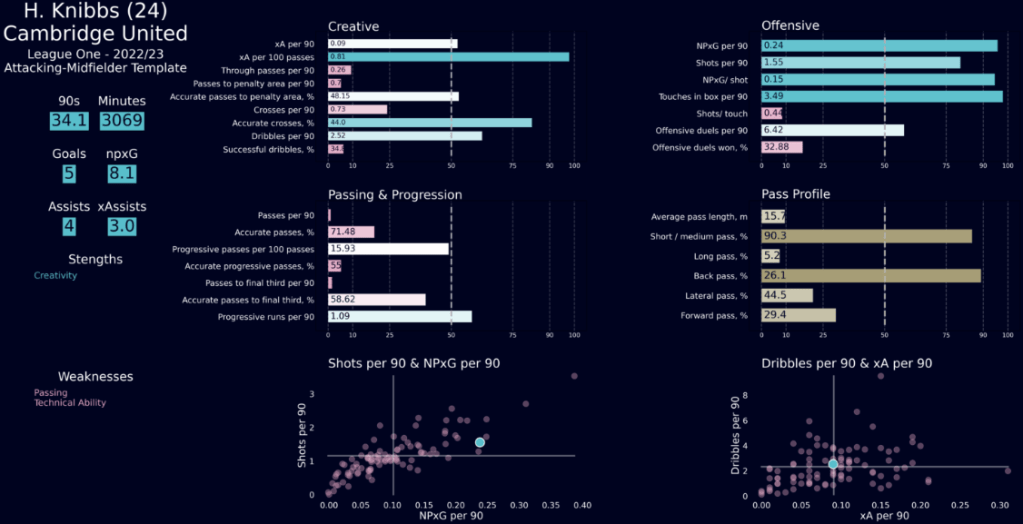 Overview: Harvey Knibbs will be leaving Cambridge United this summer after over 150 games for the club and I think a move up the League One ladder could be in store. The 24 year old is a real goal scoring threat and is at his best in and around the penalty, working in little spaces to fire off shots or set up teammates regularly. He was used as an inside forward on the left quite often for Cambridge but can also play centrally so would be a good replacement for Scully / Lang depending on whether or not either get offers, but I could also see him slotting in in the ‘Will Keane role’ as the second striker. He underperformed his xG last season which suggests that he gets into the right areas but lacks the end product, however you’d like to think that’ll change with time and we could have a real goal scorer on our hands if it does. I imagine he’ll have plenty of interest and may choose to stay down South but he’s a player I’ve liked ever since I saw him at the DW in 2022 and I’d love us to bring him in.