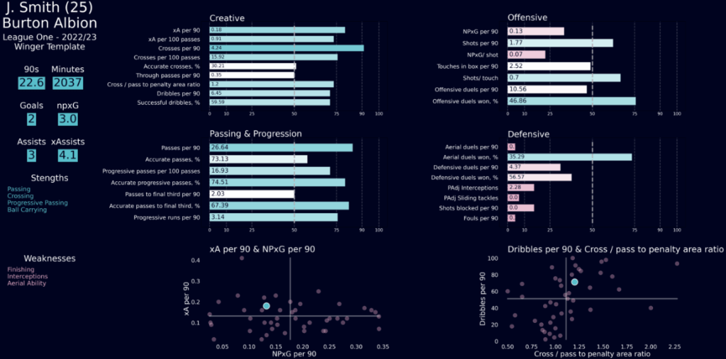 Overview: Perhaps a surprising name to start the list with but one I think could turn out to be a bit of a steal. Jonny Smith is confirmed to be leaving Burton Albion and whilst a move to a ‘bigger team’ might be unexpected I have reason to believe it could work. Compared to other League One wingers Smith shines as a creative, ball progressing star who’d add more technical quality to our forward line. A good crosser of the ball and set piece taker too, the main attraction for me is the fact he’s left footed. Adding that variety to the team alongside his technical quality and ball carrying ability would be really smart business and proof that bargains are out there if you look for them. On the face of it a player released by Burton might not sound the most exciting signing but the data suggests he could shine in a side that see more of the ball. When you consider he put those numbers up in a side that only averaged 44% of the ball makes it even more impressive. He’ll have plenty of suitors but I’d like to think we’ll be one of the bigger clubs in for him.