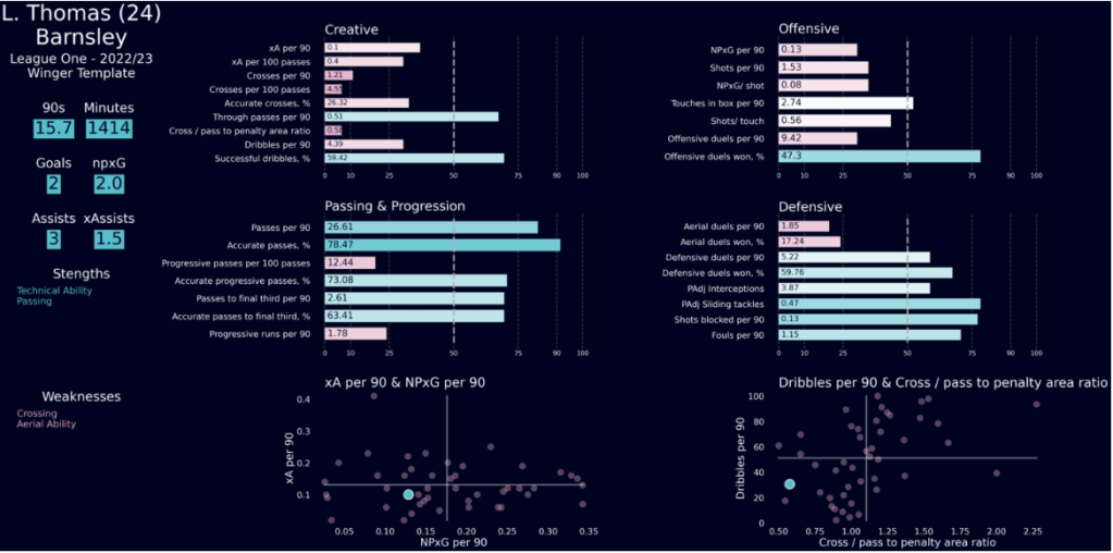 Overview: To finish the main shortlist I’ve gone for another left footed forward who could solve that problem in our squad. Luke Thomas is out of contract this summer at Barnsley (their retained list hasn’t been released yet) so there could be a chance he moves on and Latics would be a decent destination for him. He’s good on the ball and wouldn’t struggle to adapt to Maloney’s style of play thanks to his solid technical attributes. He can play anywhere across the forward line but is probably best as an inside forward on the right where he can cut inside and fire efforts in on goal. Would say he’s similar to Lang and Scully in that sense, might not offer as much as others in terms of creativity but always seems to make things happen when in possession. Decent speed and agility to use in 1v1 duels, there’s plenty to like about him and as a cheap free transfer it could work nicely.