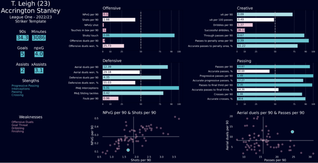 Overview: You can add Tommy Leigh to the list of non-league talents that John Coleman has turned into EFL stars. The Accrington frontman is a versatile player who could play as a striker, but I think he’d make a wonderful attacking midfielder behind a more athletic 9. At 6’2 he’s very much in the Will Keane mould and could be the perfect understudy to Latics’ top scorer, or even a replacement if he moves on this summer. The graphic above is comparing him to other strikers but his passing and creative numbers are still very impressive and suggest he’d fit in well as part of a fluid front three, something we’ve seen Keane be used in a lot. He’s a goal threat from deeper areas and decent in the air as you’d imagine given his height, but not necessarily a profile we need to bring in right now. I’d say he’s probably the perfect replacement for Keane should he leave and wouldn’t cost much money at all, but for now I’d be looking elsewhere. A very good player though, keep an eye out for him.
