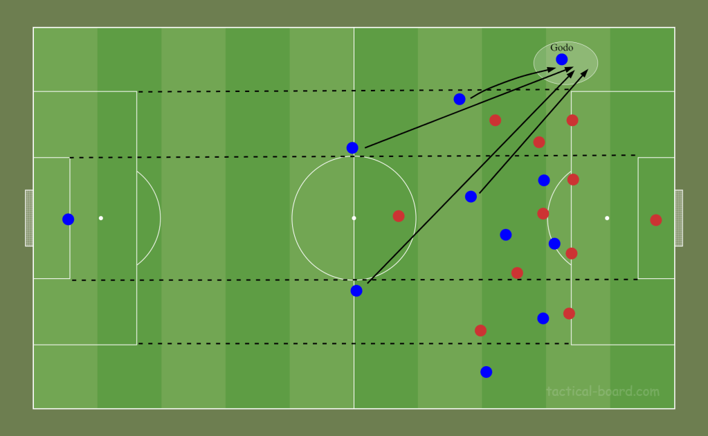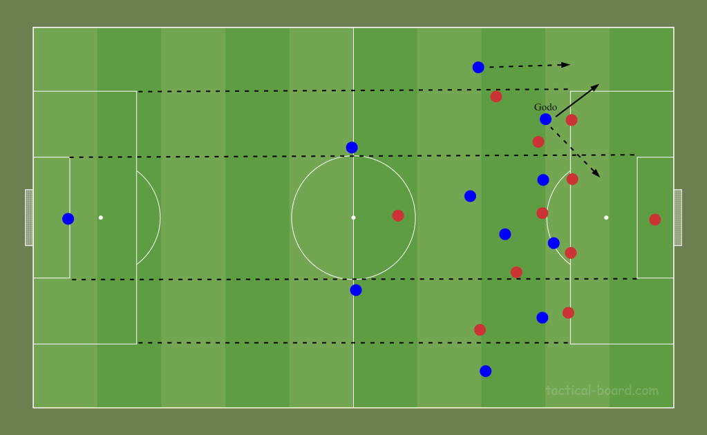 This graphic shows Godo in the wide space, hugging the touchline and pulling a low block away from their compact structure. If we can get the ball to him in these positions he’ll have space to run into, attack his marker and enter the box in a dangerous position. His end product from the corner of the six yard box looks good so that’s where we want to get him as often as possible.