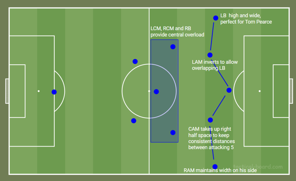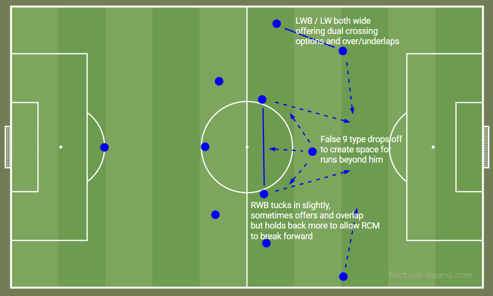It relies on a lot of movement and well drilled patterns of play because there are fewer attacking players on the pitch. The profiles we have at LWB (Jones, Pearce) tend to mean they bomb on and hold their width, but when Steven Sessengon plays there he’ll usually invert and Sean Clare will be the wider wing back. It’s all very fluid and is probably still a while away from full clicking.