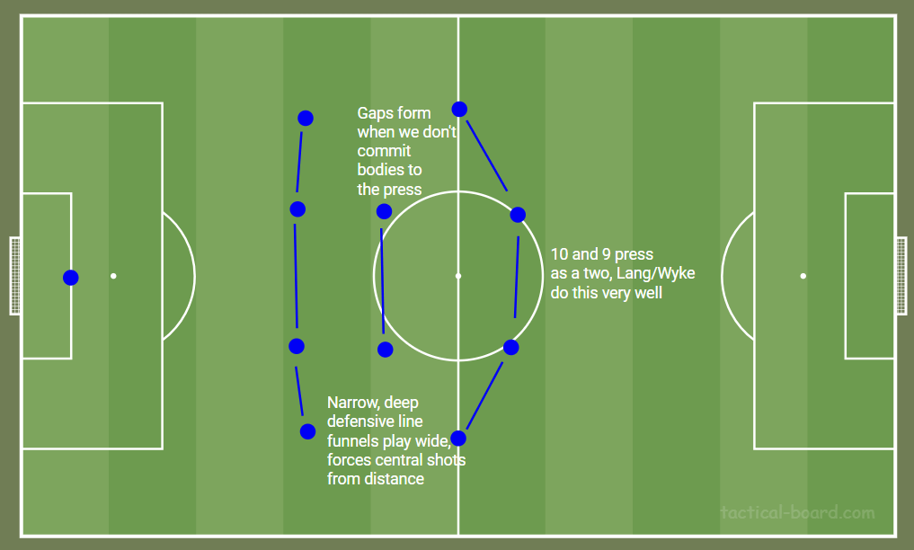 The 4-2-3-1 out of possession needs so much work. Most of the issues would be solved by committing to either an aggressive press that sees our defensive line push up 10 yards higher when we trigger a press, or we commit to a low block and focus on limiting space, shooting opportunities and really dig in. Our players suit the high press more and while it has more margin for error I just don’t think this 50/50 plan does much for us.