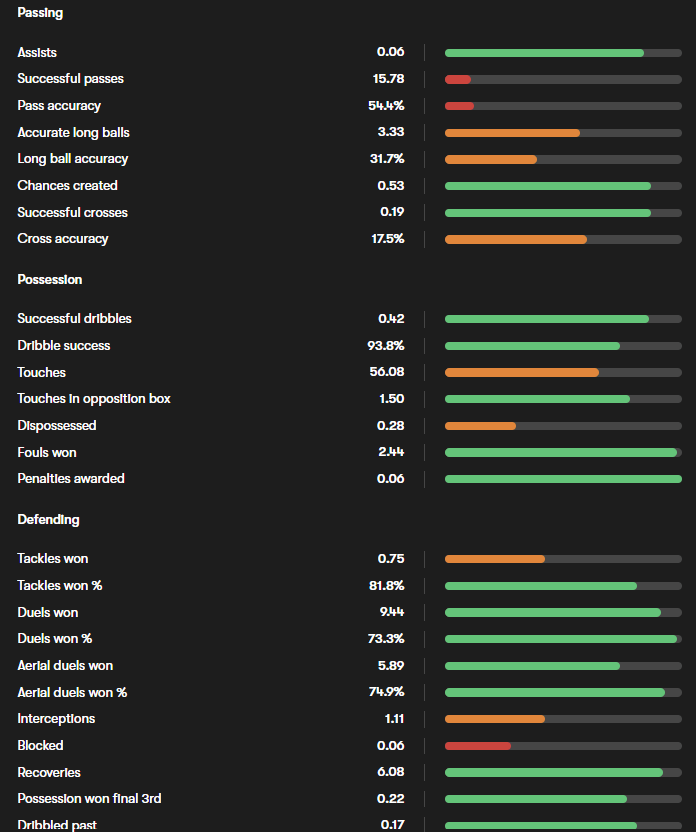 That being said he does offer something on the ball and isn’t afraid to make a darting run down the wing to progress the team up the pitch. While he’s not particularly quick you’d do well to stop him when he gets going given his size and strength.