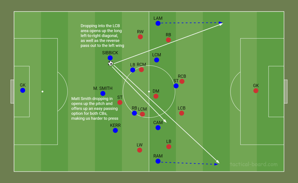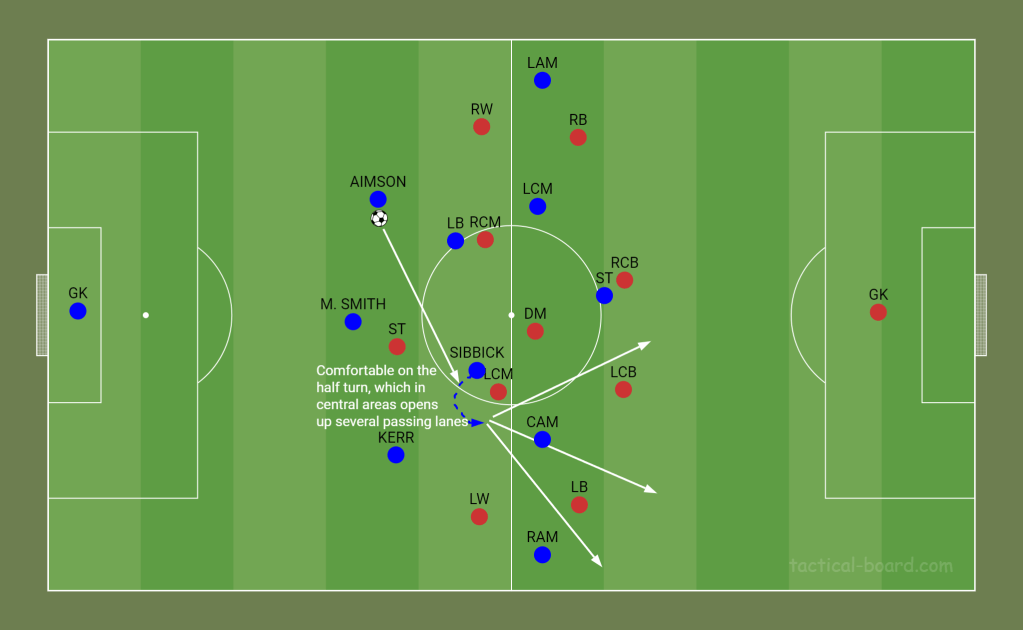 If we are to play a back four this season, and Sibbick plays as one of the two centre backs, then a lot will be asked oof him in possession. He will need to be confident enough receiving the ball on the back foot or the front foot, controlling it under pressure and progressing it with long-range diagonal passes, incisive ‘line breaking’ passes and driving runs forward.