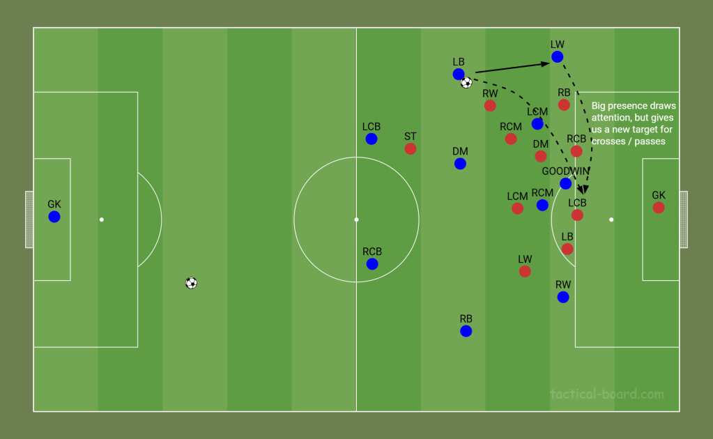 Per 90 minutes last season, on average, his efforts averaged 0.5 xGOT, the metric that measures how likely a shot on target is to go in based on the area of the goal it hits. Not only does this show a good level of finishing ability, but also good composure and decision making in front of goal. Goodwin appears to get himself in the right place at the right time, which we need desperately.
